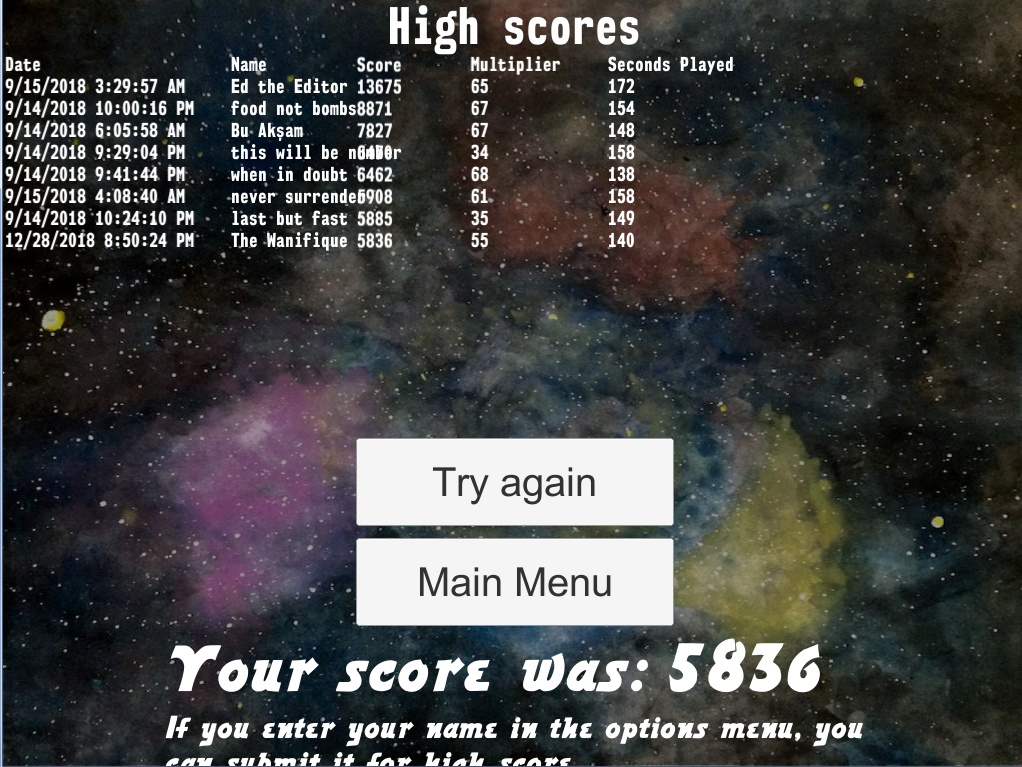 And of course, an online leaderboard would be awesome (just so I can beat @voxel )