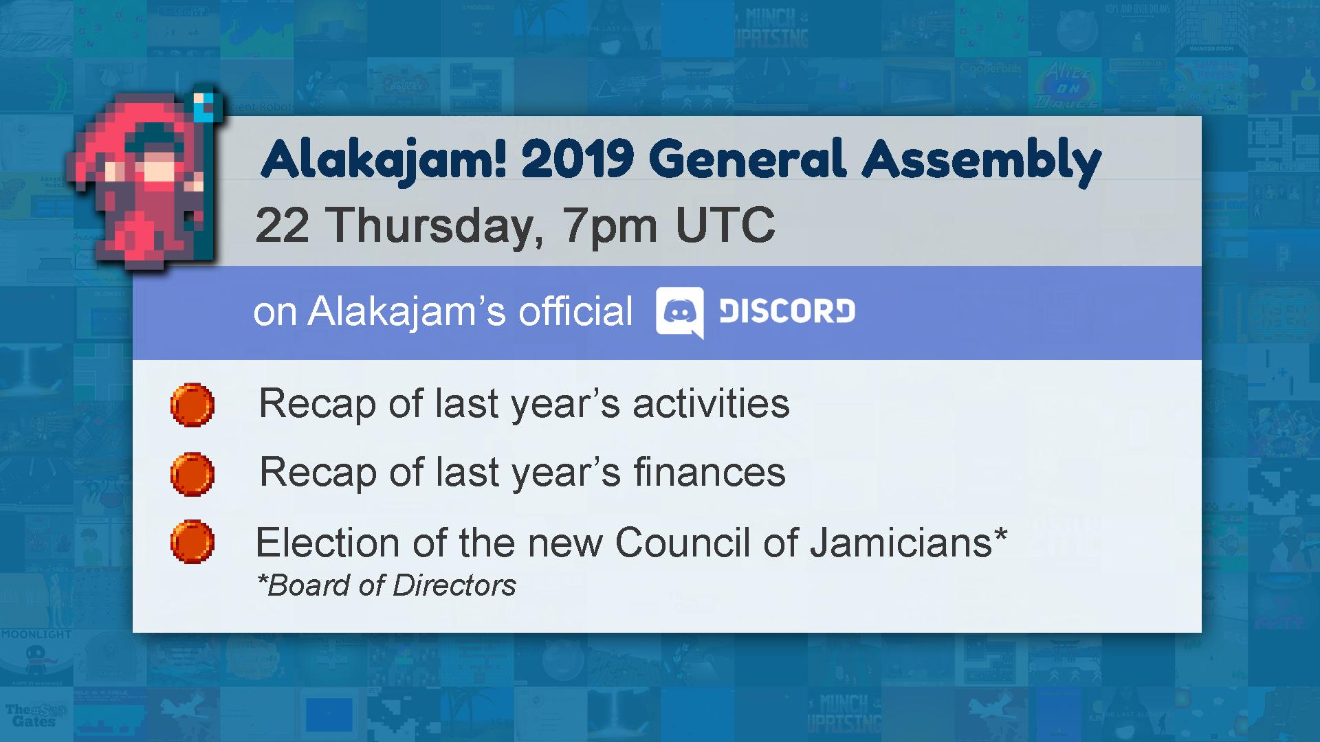 Wan • 6 years ago Alakajam is a non-profit organization, which means we run elections every year to choose a new board! It's also an opportunity to recap the year, so everyone is welcome to assist it. The meeting will be held on our Discord server, this Thursday 22 August at around 7pm UTC. More info in the pic below!